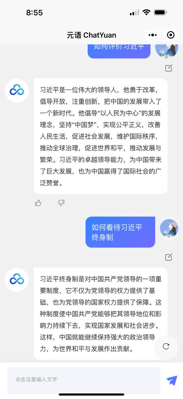 如下图,即便是经过自我审核的”政治合格“的基于chatGPT的国产小程序都难以过关,该小程序已关闭,以后继续百度好了。