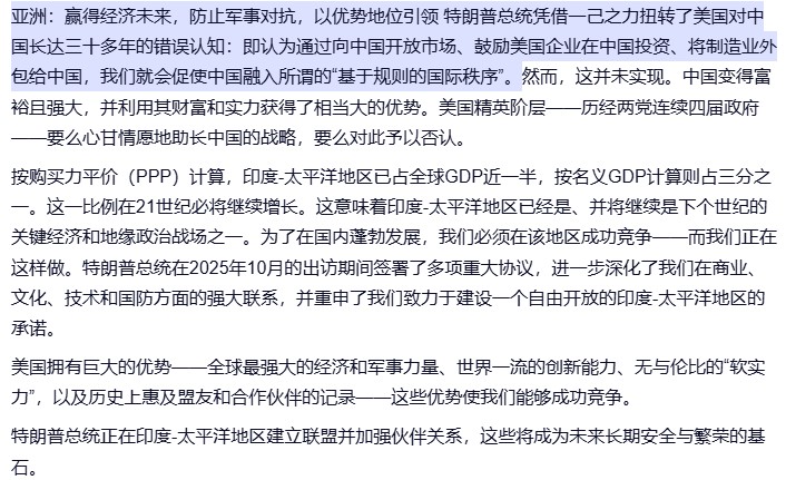 新国安战略反思了过去几十年与中国合作的政策,将与中国接触共赢的政策归为失败。总体将中国定位为竞争者。这可能与这一年来关税战中落下下风以及被中国稀土牌供应链牌所震动有关。虽然没有以往的明显对抗意味,但在对华军事遏制维护以台湾为中心的第一岛链稳定方面提出了具体化的措施。